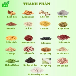 – Thành phần: 19 loại Đậu và Hạt nguyên chất 100% giàu Protein không đường gồm: Hạt điều, hạnh nhân, hạt sen, gạo nếp, gạo lứt, ý dĩ, đậu đen, đậu xanh, đậu nành, đậu đỏ nhỏ, đậu đỏ to, đậu trắng mắt cua, đậu gà, đậu ngự, đậu lăng, đậu hà lan, yến mạch, hạt kê, ngô nếp